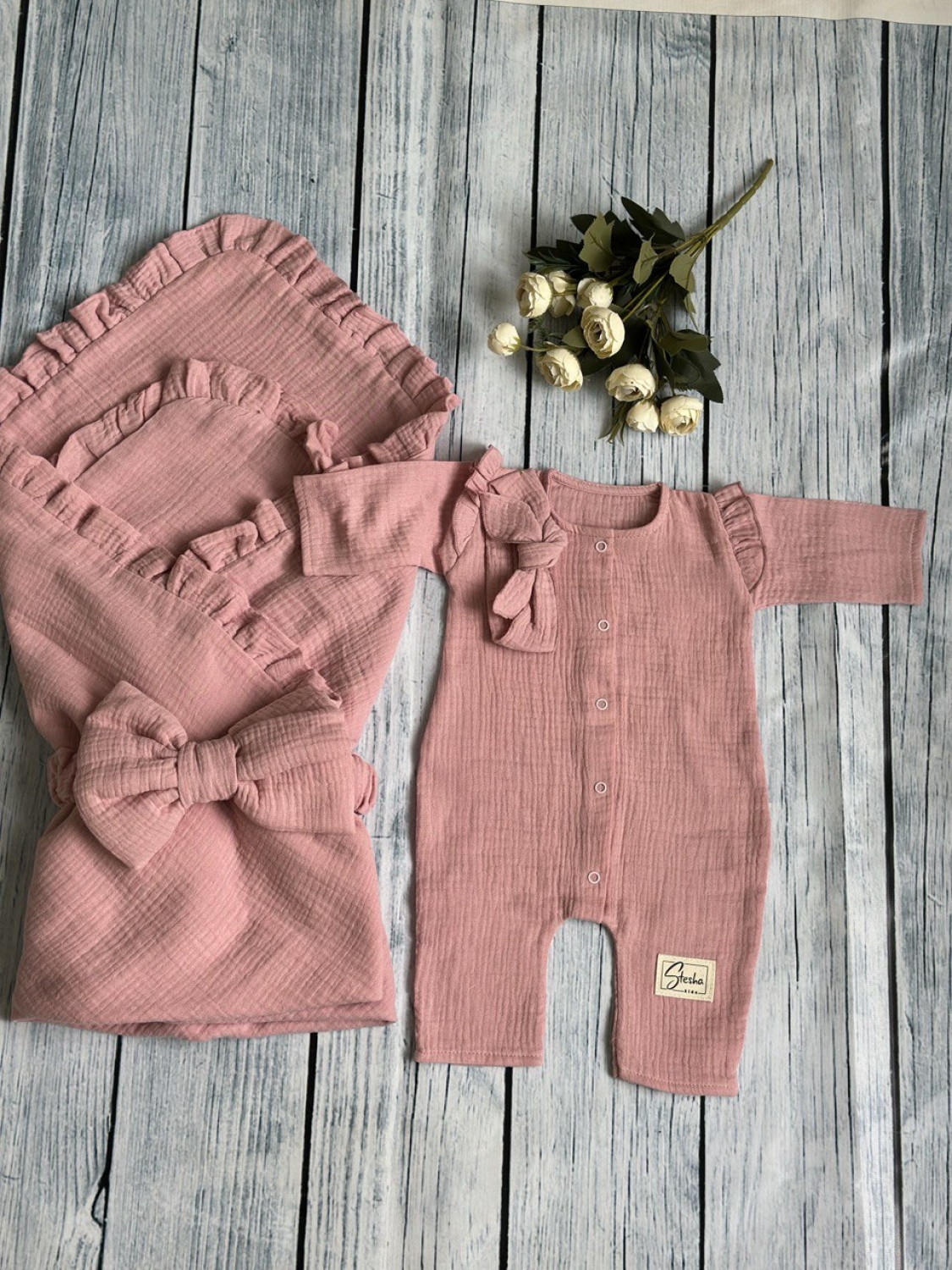Теги: Купить детские конверты, комбинезон оптом, детские конверты на выписку оптом. 335-П. Комплект из детского комбинезона, р 56 и конверта муслин, хлопок 100% 90/90 см, пудра цена,отзывы официальный сайт "Стеша Кисловодск"